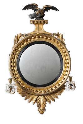 the circular convex mirror plate in a reeded back slip and ball mounted moulded frame, with a waisted pedestal finial with carved gilt and ebonised eagle, the mirror flanked by a pair of scrolling candle arms hung with prism drops