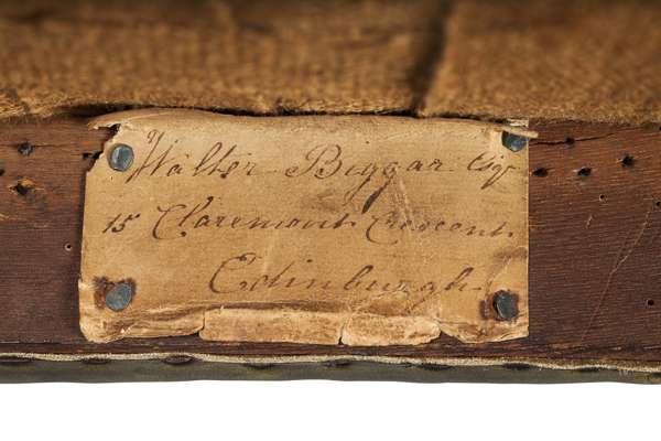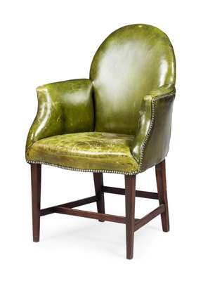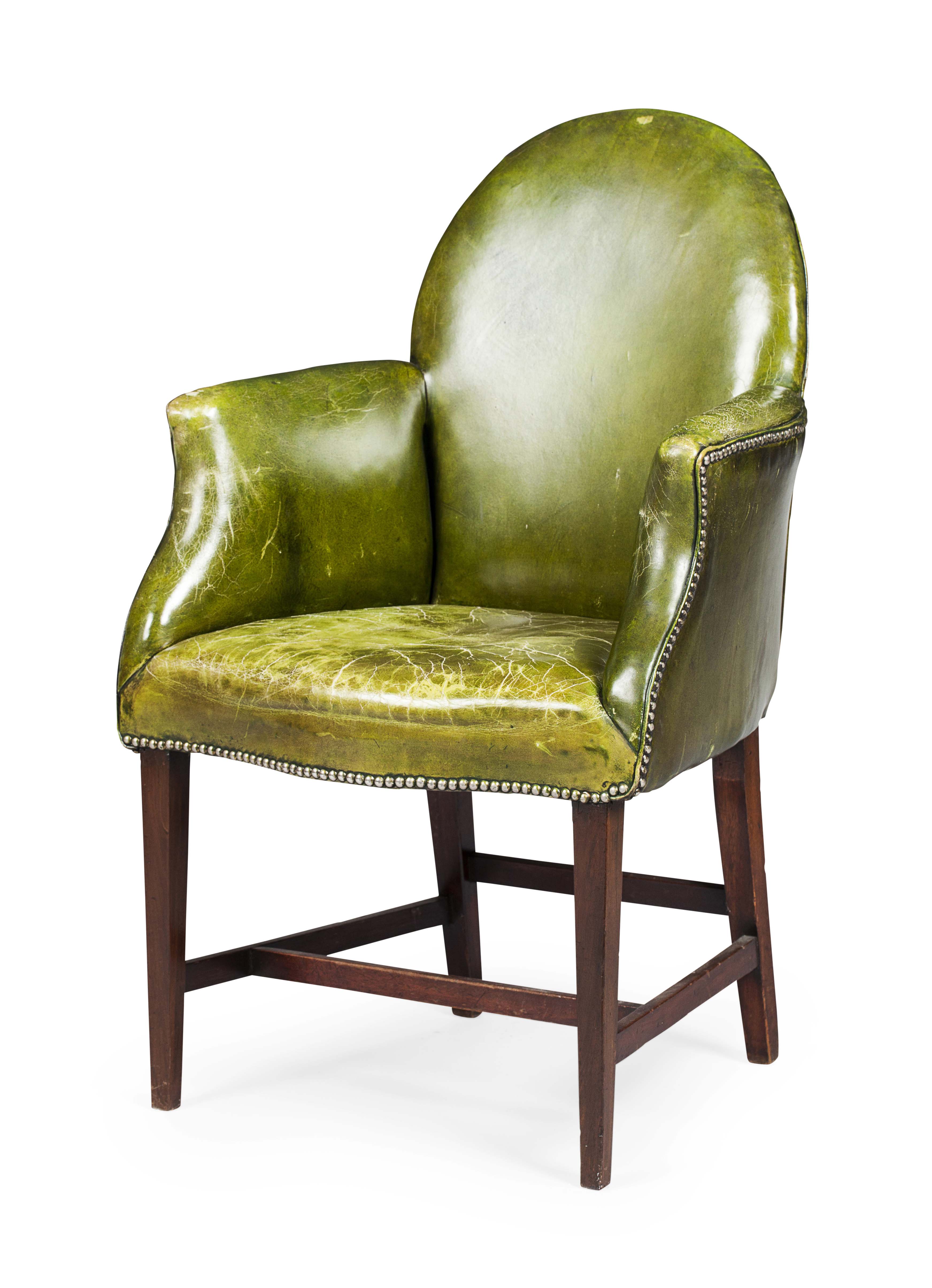 the arched padded back, enclosed arms and serpentine seat in green leather upholstery, raised on square tapered legs joined by stretchers, bearing an old paper label to the inside rear seat rail inscribed 'Walter Biggar, Esq./ 15 Claremont Crescent / Edinburgh'