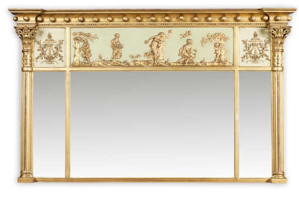 the breakfront cornice with applied balls over a frieze panel depicting classical lovers and attendants on a pale green ground, above three bevelled glass mirror plates, flanked by reeded Corinthian half columns