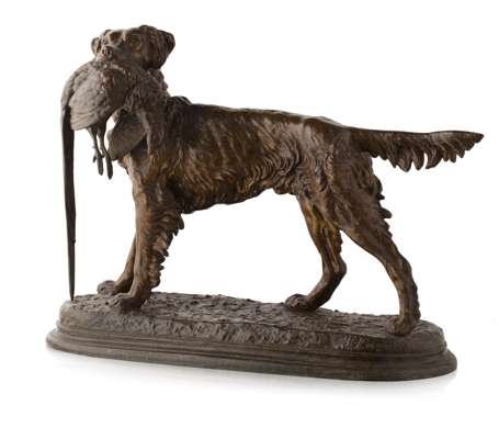 with a pheasant in its mouth, on a naturalistic cast oval base, signed * MOIGNIEUX, 38cm long, 29.5cm high; together with a PAINTED SPELTER FIGURE OF A PHEASANT, on a naturalistic base, 30.5cm wide, 19.5cm high (2)