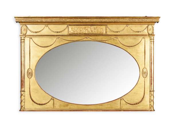 the bevelled mirror plate within a moulded frame with bead and husk swags, the frieze centred by a gesso plaque depicting putti emblematic of Arts and Science, beneath a Key moulded cornice