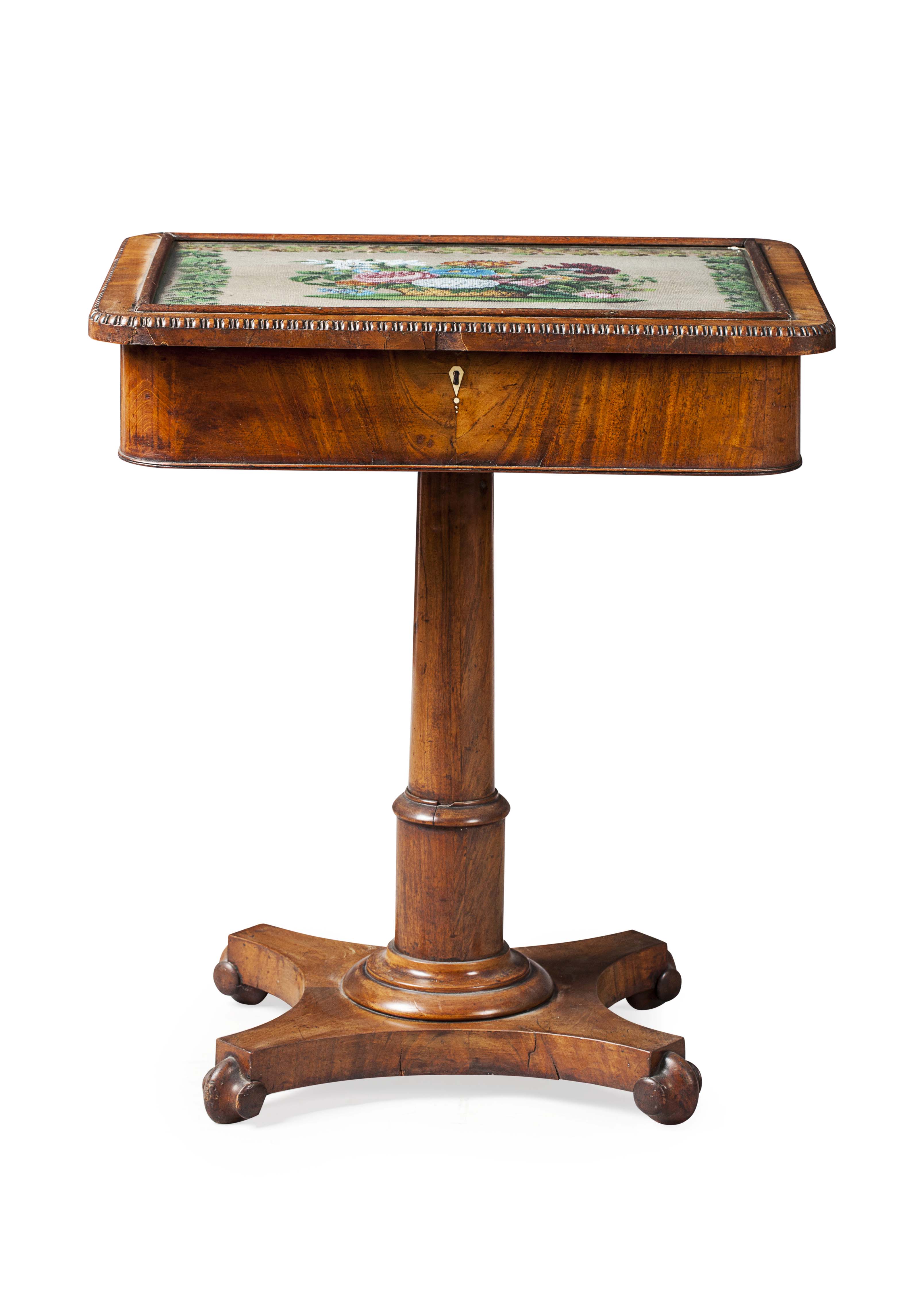 GEORGE IV MAHOGANY WORK TABLE WITH BEADWORK PANEL TOP
