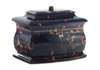 of sarcophagus form with an ogee lid and bombe shaped base, opening to reveal a void interior with ivory borders