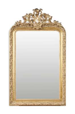 the arched mirror plate within a frame moulded with foliate scrolls and an open scrollwork cresting centred by a shell motif