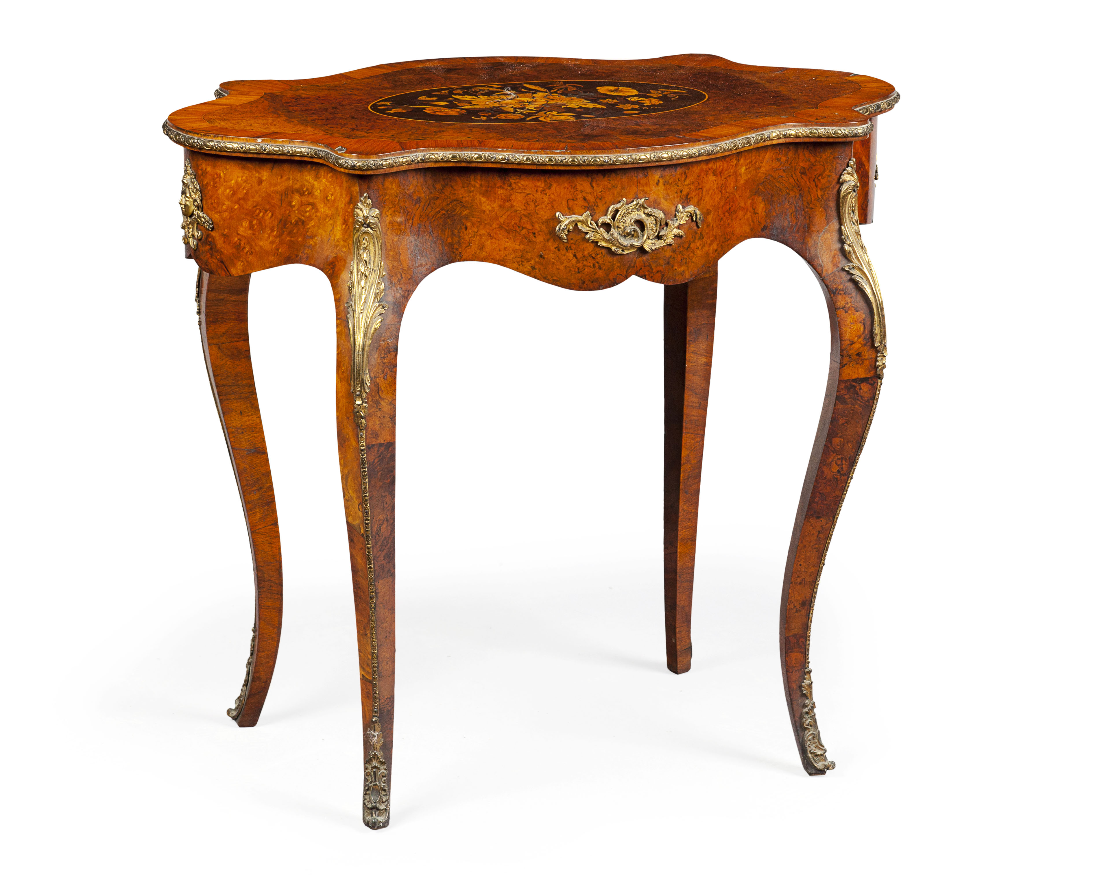 the serpentine shaped oval top with floral marquetry inlay, raised on cabriole legs with gilt metal mounts throughout