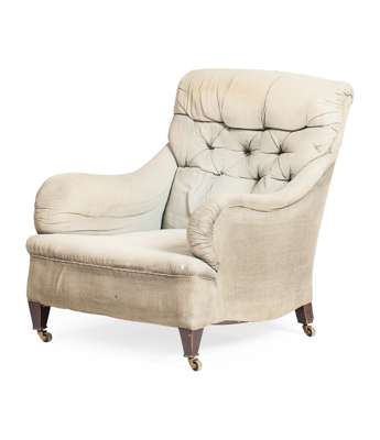 the button upholstered square back and downswept enclosed scroll arms, raised on tapered square mahogany legs ending in brass caps and castors, in original pale green fabric, with a later rose slip cover and cushion