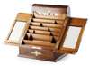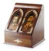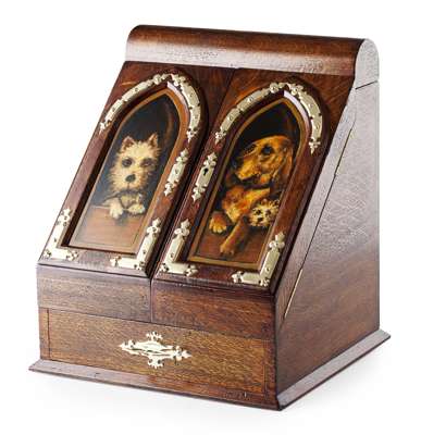 the sloped hinged front painted with images of dogs above a single drawer, fitted with brass mounts, opening to reveal a fitted interior and hinged domed top