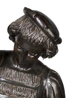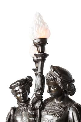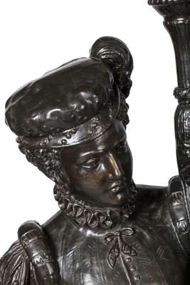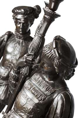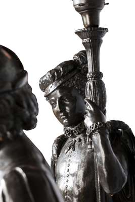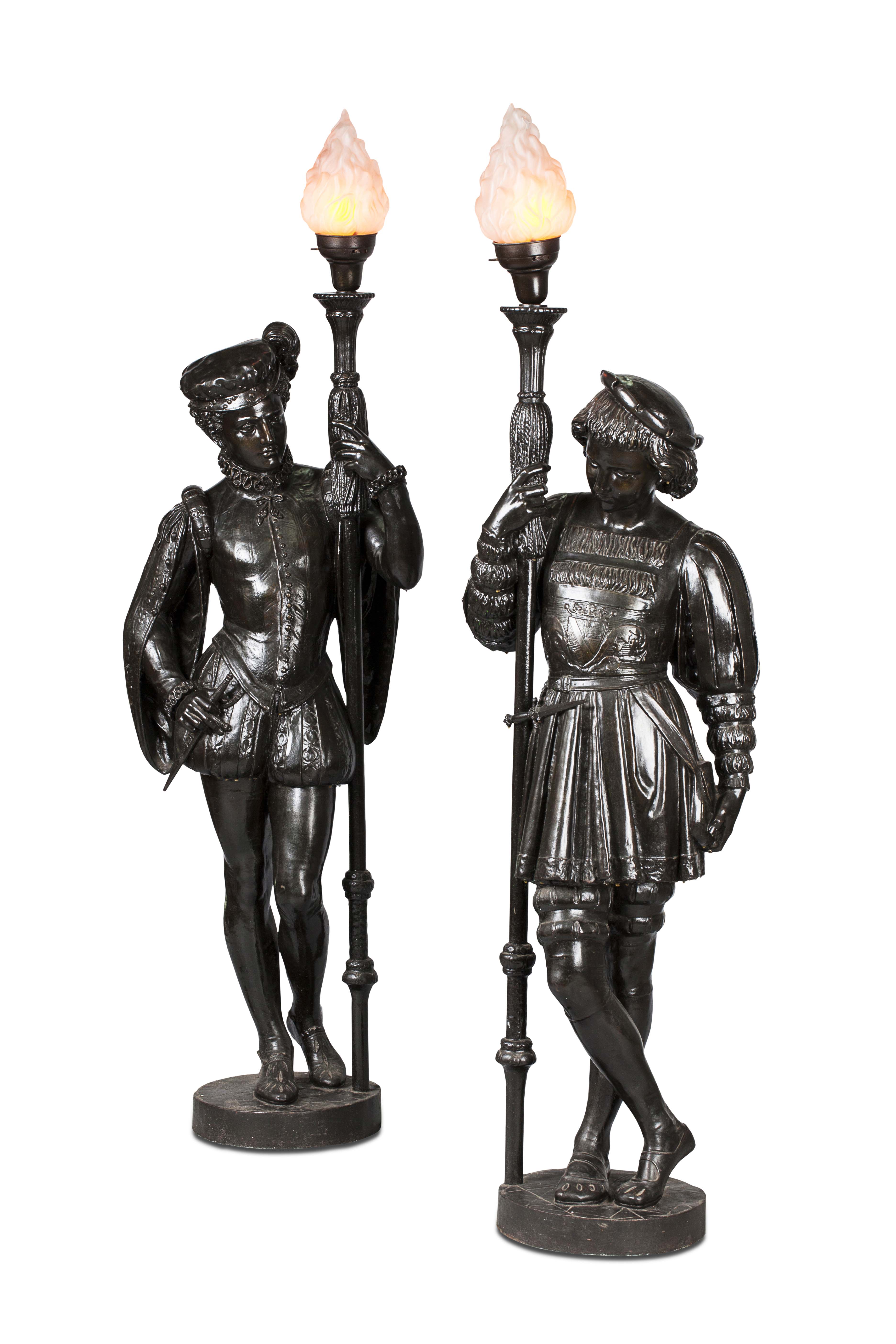 three-quarter life size, dark brown/black patina, modelled as a pair of Renaissance page boys holding torcheres, with frosted glass 'flame' shades, on circular bases, fitted for electricity (2)