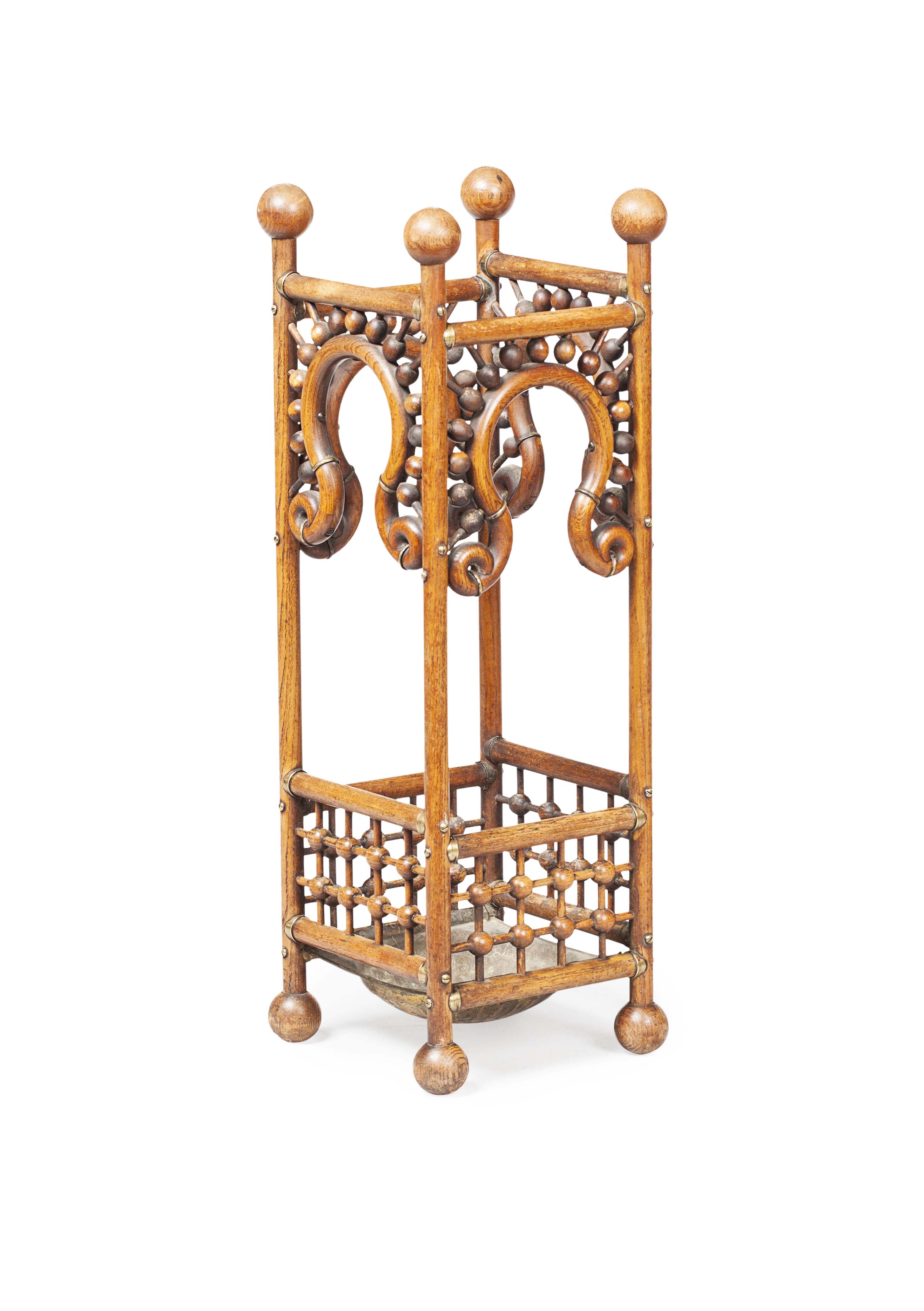 with stick and ball sides with brass ring mounts and a hammered brass drip tray, on ball feet with ball finials to the corners