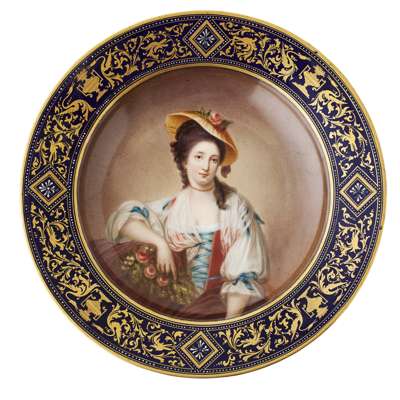 painted with a portrait of Countess Harcourt, within a cobalt border with gilt and white jewelled highlights, blue beehive mark and inscription 'Honble Countess Harcourt' verso