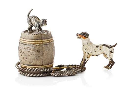 cast as a cat upon a hinged barrel confronted by a terrier, opening to reveal a gilt metal interior