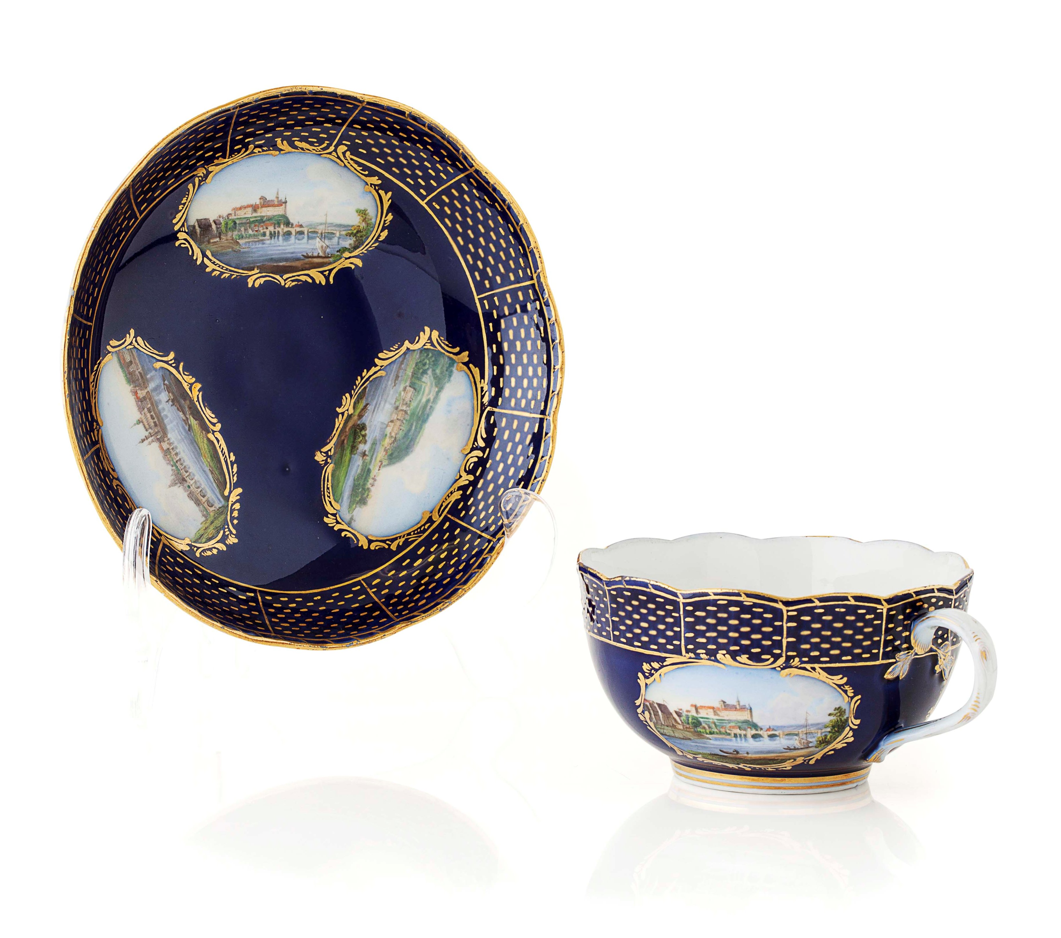 the cup painted with panels depicting Dresden from the south west, Meissen and a view of the Elbe, the saucer painted with views of Meissen, Dresden and The Riverside Palace, Pillnitz, reserved on a blue ground with gilt embellishments, painted crossed sword marks (2)