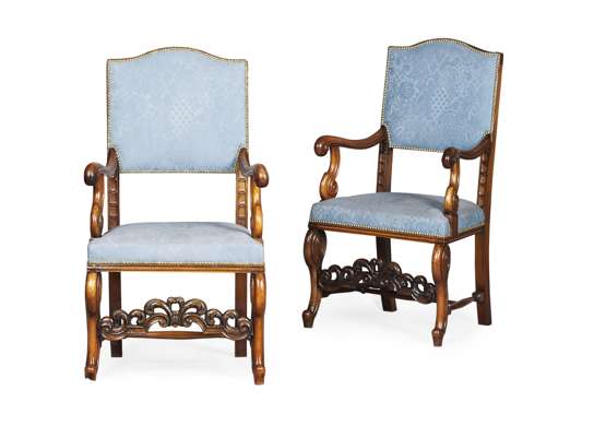 with arched padded backs and seats in blue upholstery with brass nail head decoration, with scrolled open arms, raised on scrolled legs joined by arched scroll carved stretchers, each bears makers label MARSH, JONES & CRIBB/ 11457 (2)