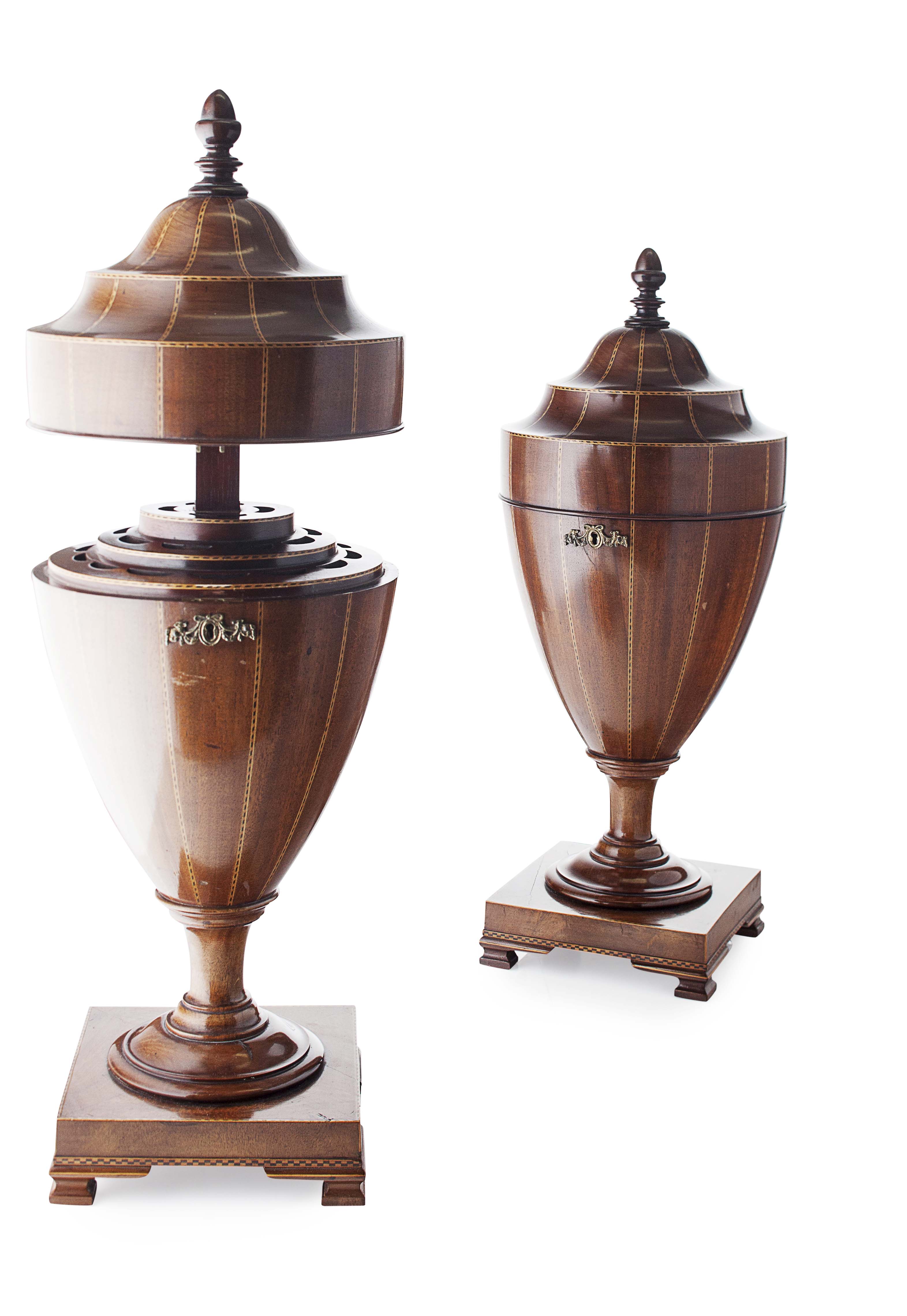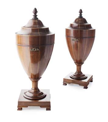 PAIR OF GEORGE III STYLE MAHOGANY URN SHAPED KNIFE BOXES
