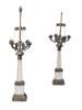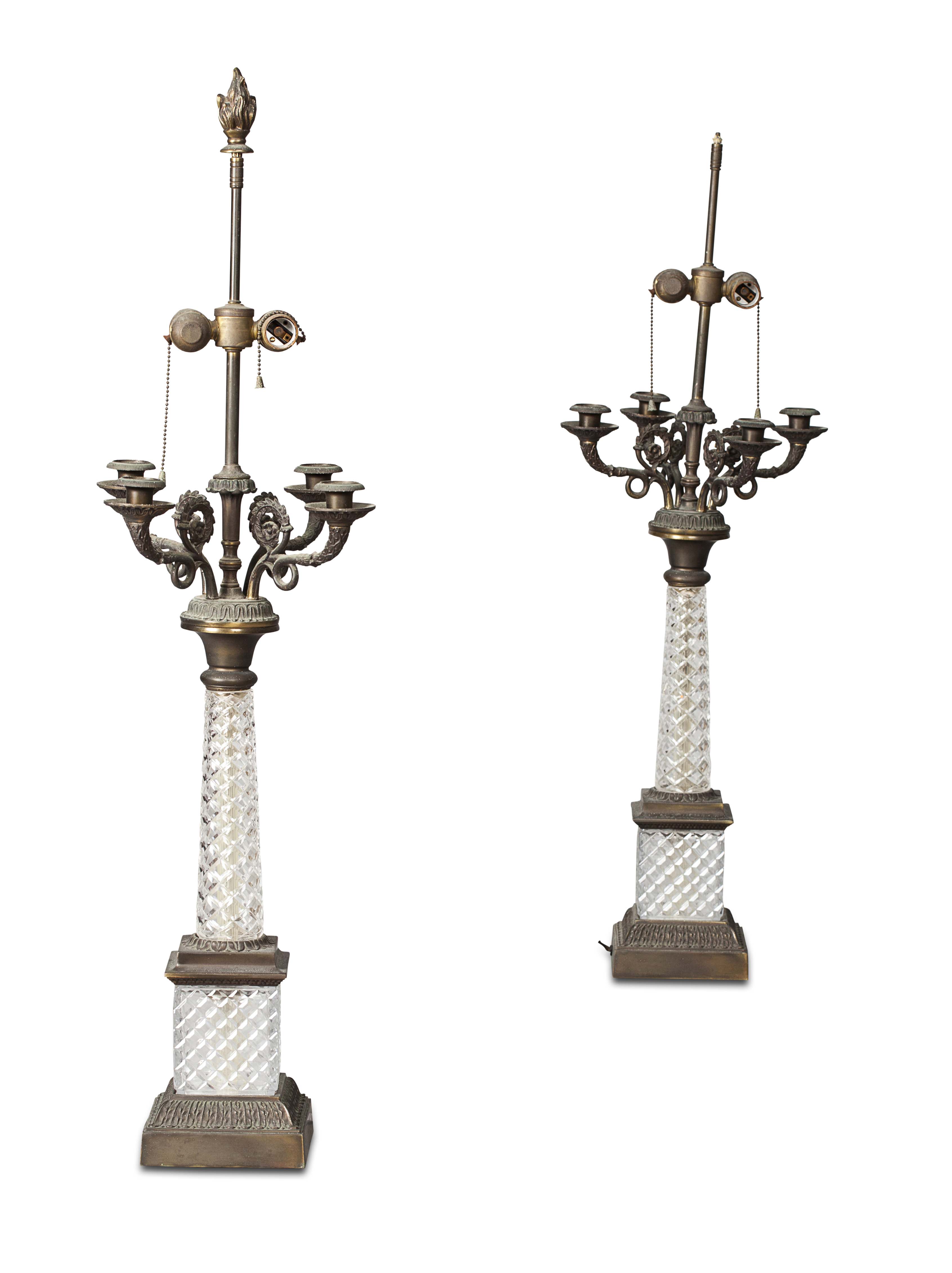 each with a faceted glass column and square glass base with leaf cast brass mounts, issuing four scrolling candle branches and a central lamp fitting; one with flame finial (2)