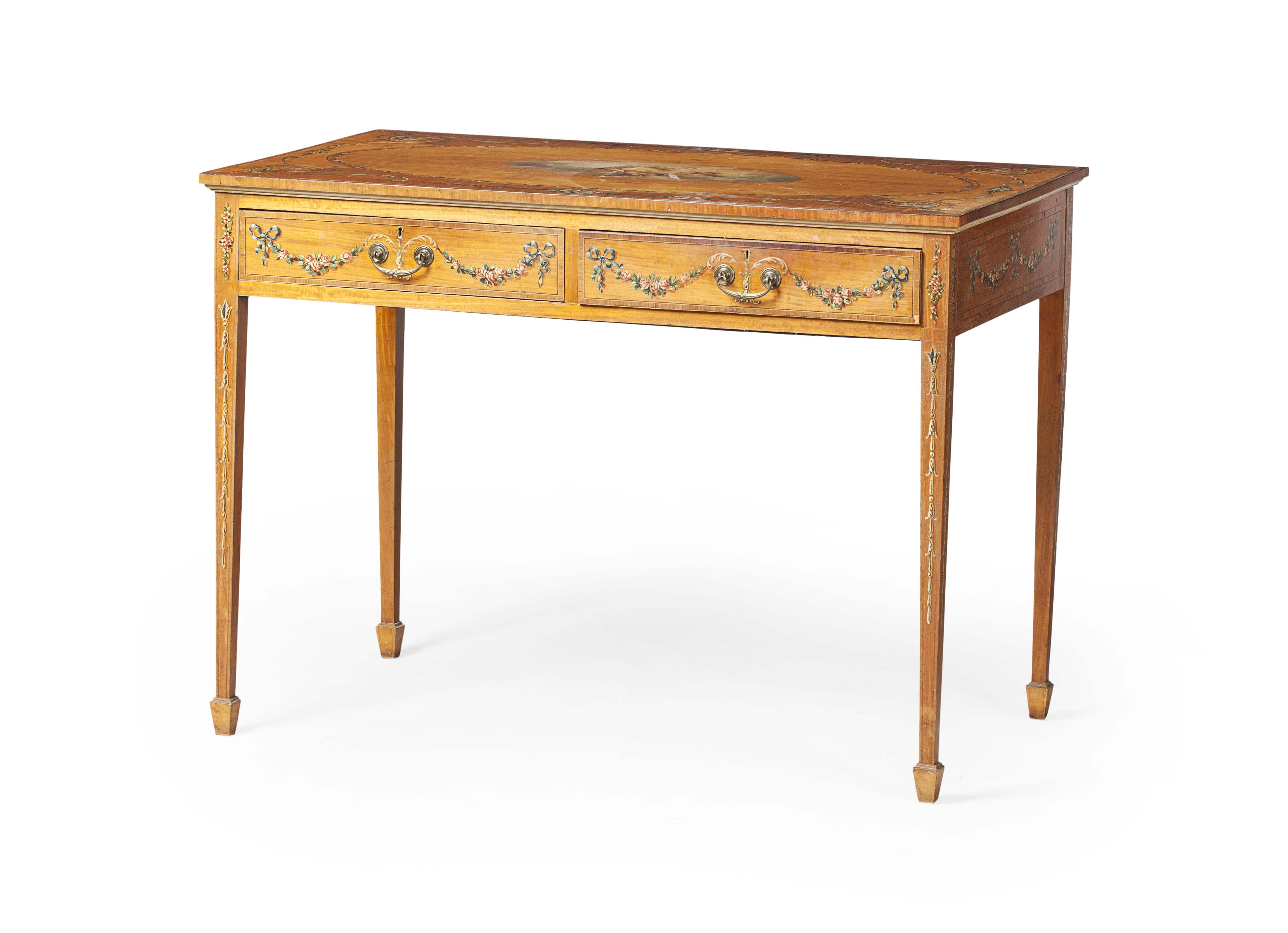 the rectangular top painted with an oval reserve depicting putti amongst clouds within a floral garland border, above a pair of short frieze drawers raised on square tapered legs ending in spade feet