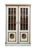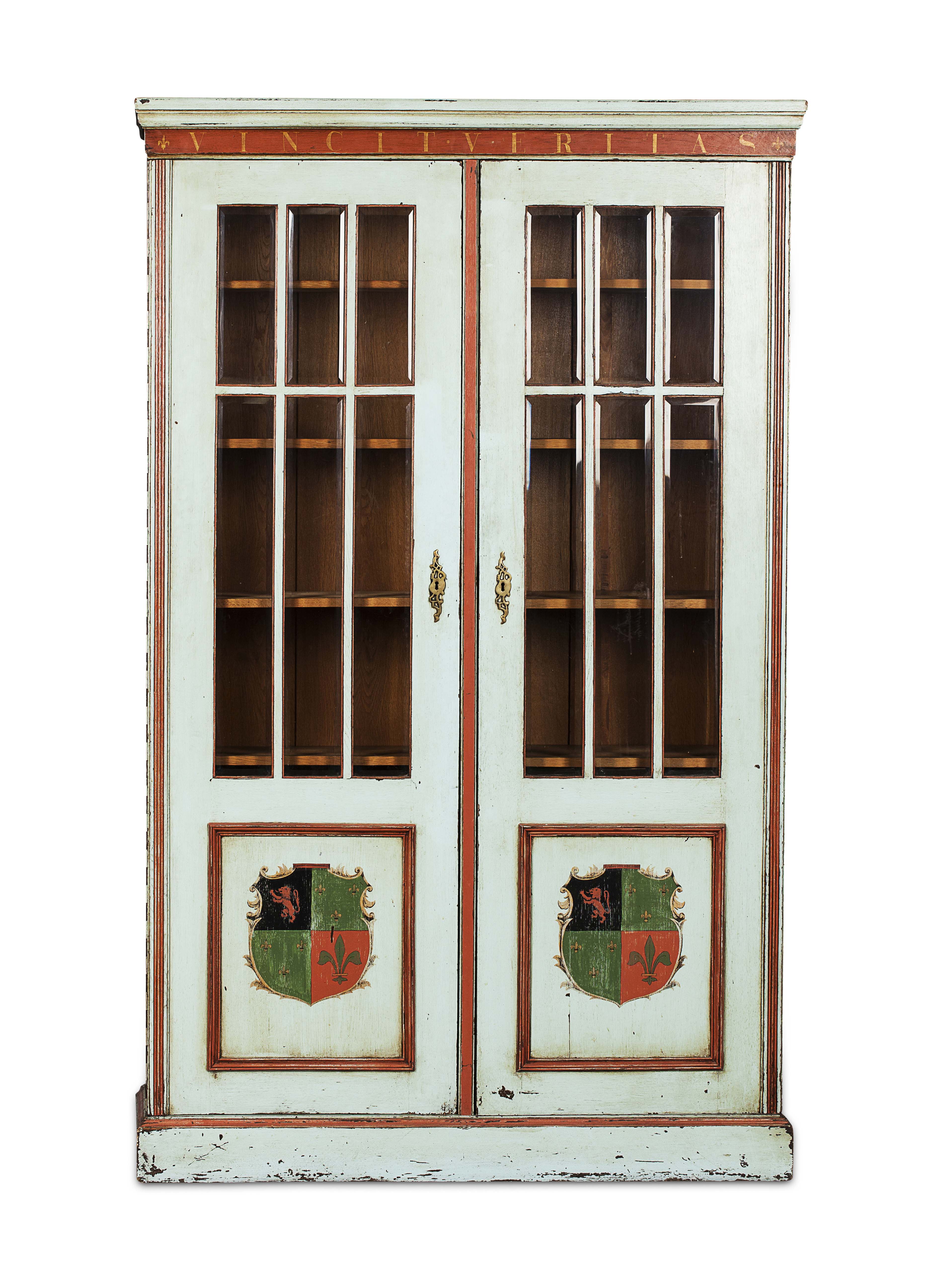 the frieze painted with the motto 'VINCIT VERITAS' above a pair of bevelled glazed doors with lower painted armorial panels, the divided interior with adjustable shelves, the corners with reeded moulded, on a plinth base