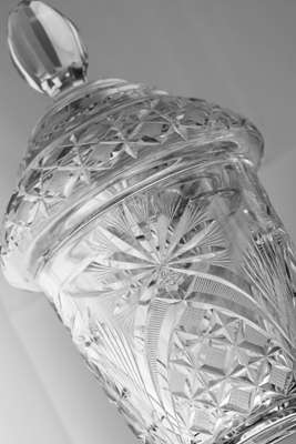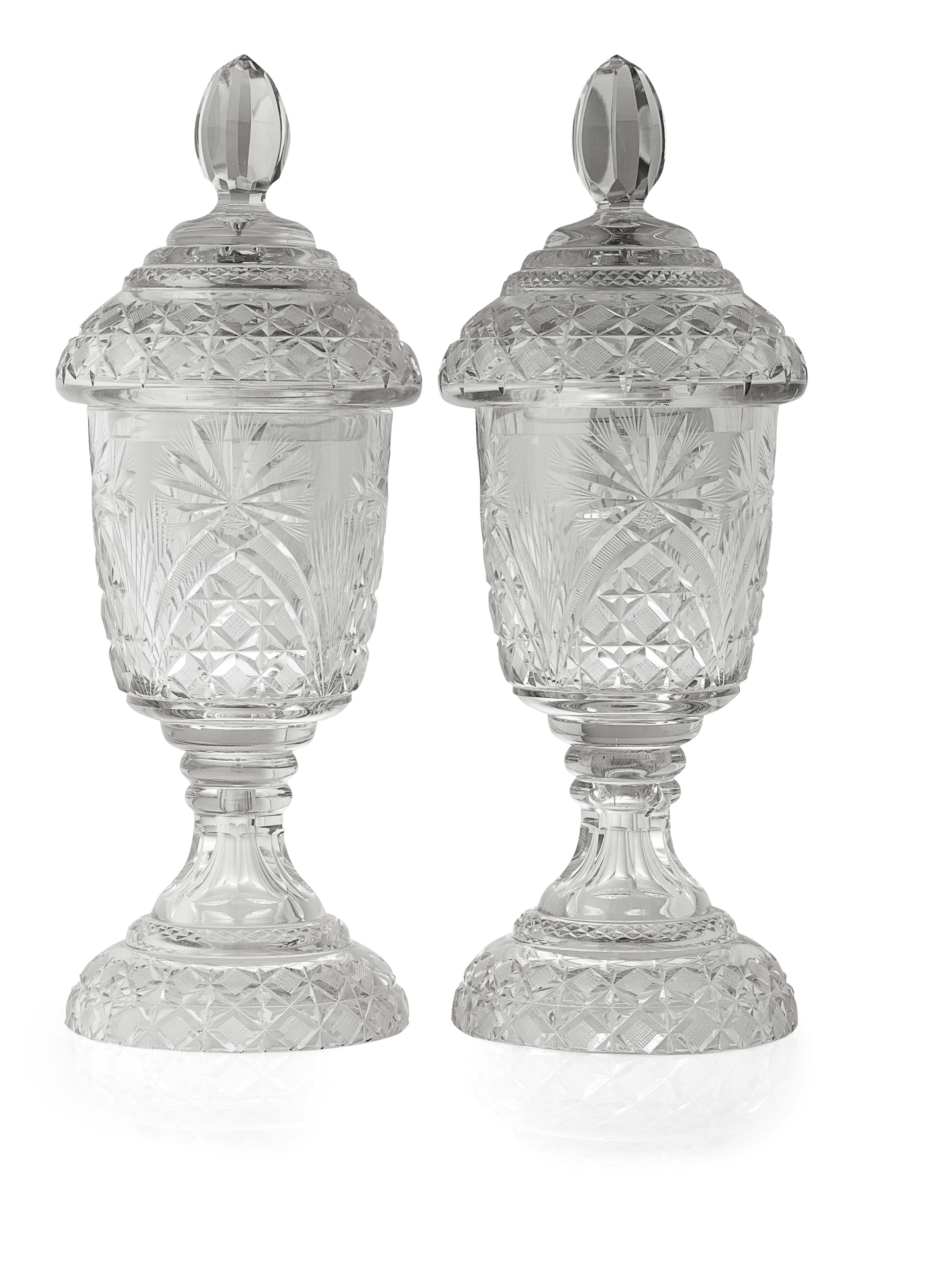each with a large knop finial above the deep-cut glass domed cover, bowl and splayed foot (2)
