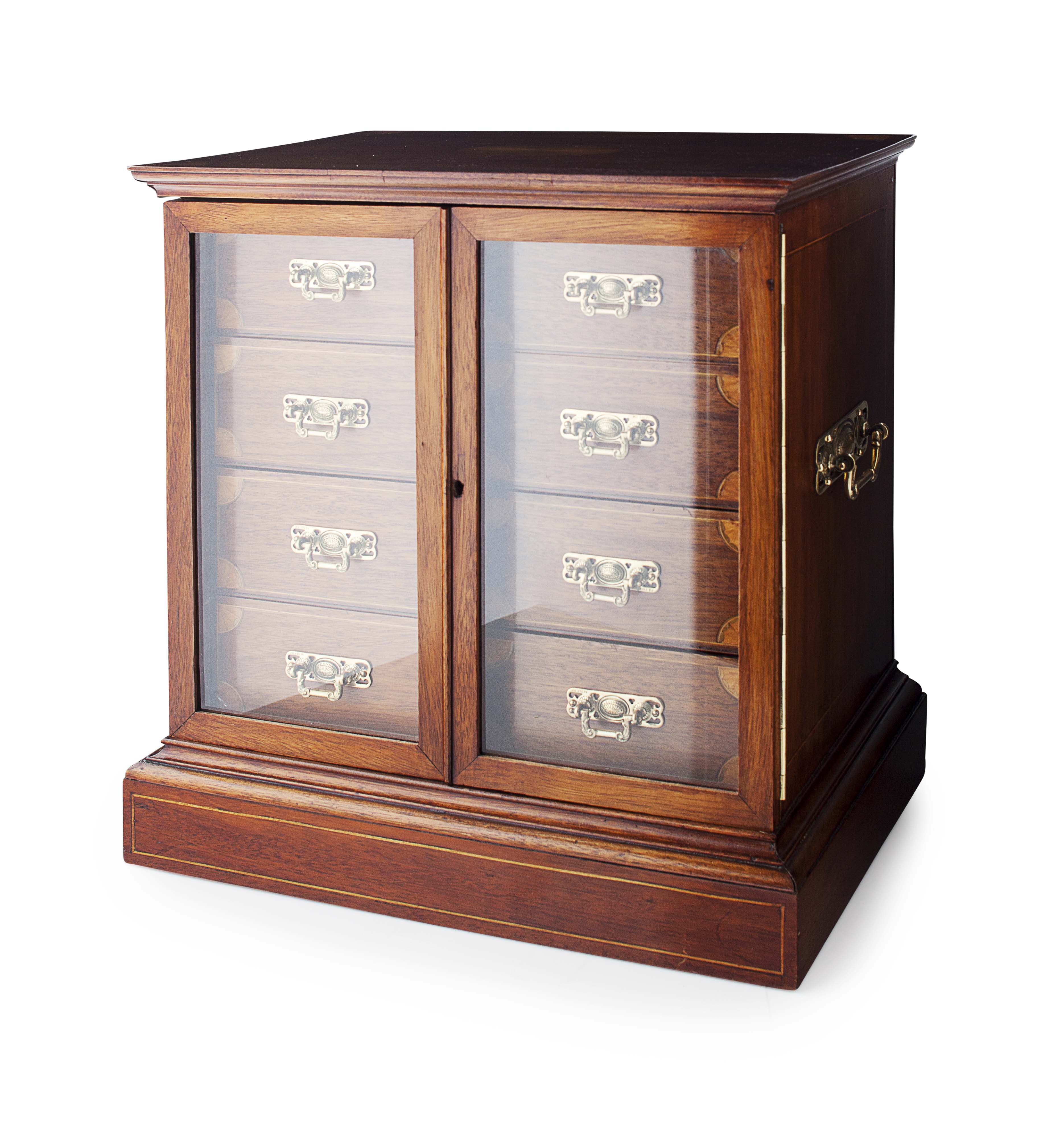 of rectangular form with an inlaid surface and twin brass handles, the glazed doors opening to reveal eight fitted drawers with cedar linings, on a plinth base