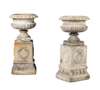 of low campana form moulded with fruiting vines and stiff leaves, on separate square pedestal plinth bases moulded with laurel wreaths and acanthus on moulded bases (2)