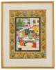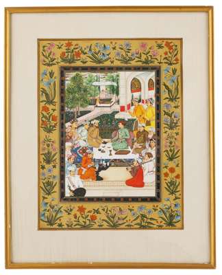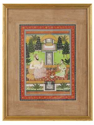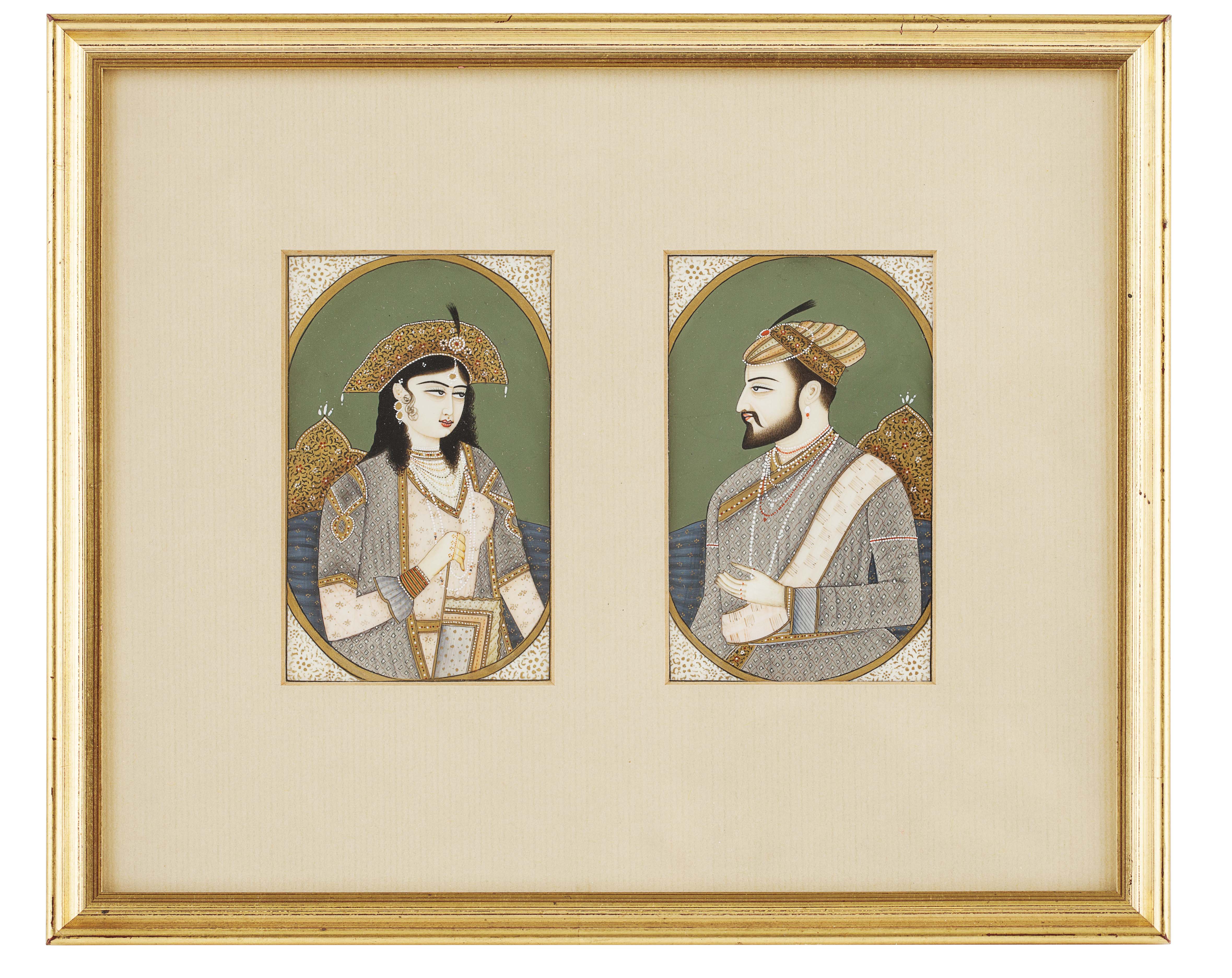 comprising a pair of portraits on ivory depicting Mumtaz Mahal and Shah Jahan, 9.5cm x 6cm each; a painting on paper depicting a Mughal ruler and companion with a huqqa seated in a garden with fountains, signed lower right, 23cm x 16cm, excluding borders; and a painting on paper after Bichitr, 'Garden Gathering with a Prince in a Green Jama', 22cm x 16cm excluding border (3)
