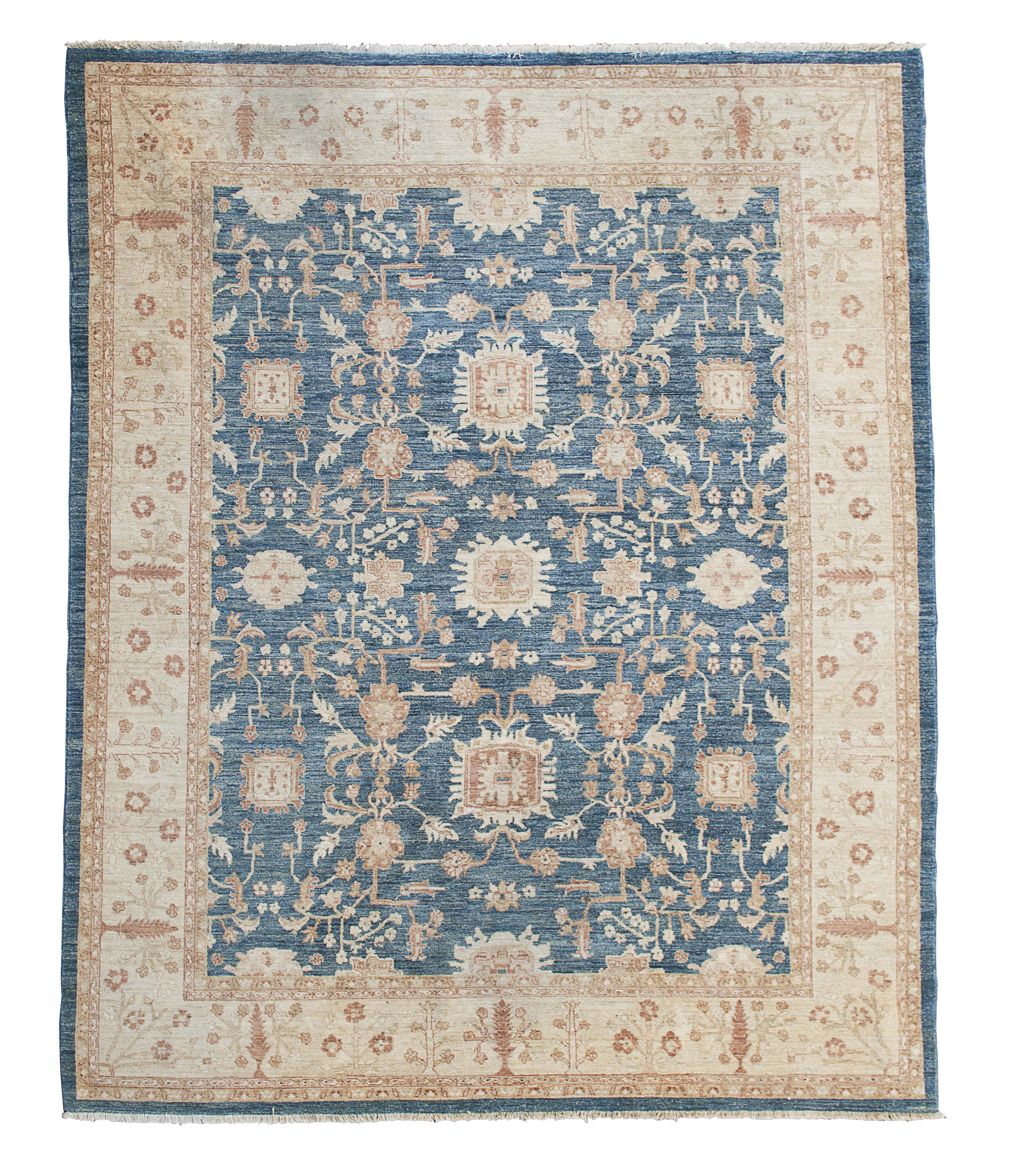 the abrash blue field with stylised palmette and vine pattern, within cream tree and foliate border between bands
