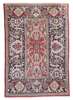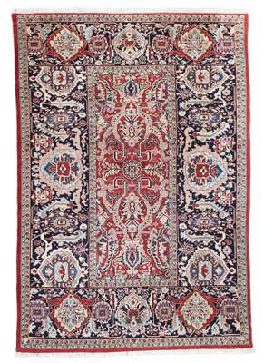 the narrow red field with palmette and vine pattern, within wide dark indigo turtle palmette and vine pattern border