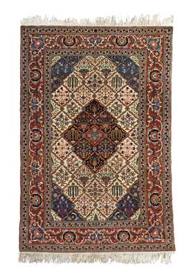 the cream field with indigo and red medallion, blue spandrels and allover foliate lattice pattern, within red palmette and arabesque vine border between bands