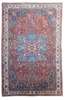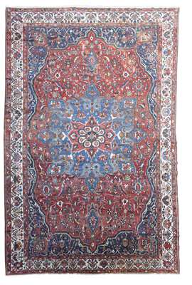 the red field with blue and red medallion, similar spandrels, within ivory stylised palmette and vine border between bands