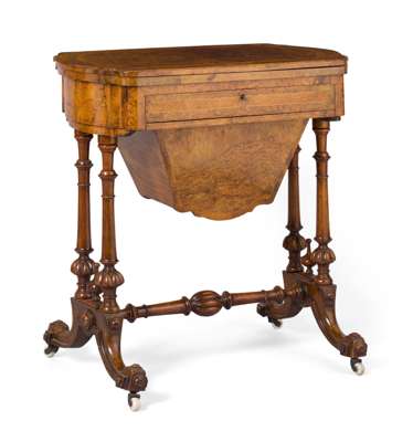 the pivoting foldover top opening to chequer and backgammon boards, over a fitted frieze drawer and basket, on turned supports and downswept legs united by a stretcher, with ceramic castors