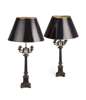 modelled as candelabra, each with four scrolled candle arms above square fluted columns, on four scrolled feet, with tole shades (2)