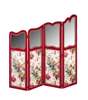 each panel with a red velvet frame, the scrolled graduated top above a glazed panel and flowerbud and foliage textile panels