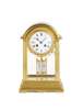 the arched pediment above the four glass case with a white enamel dial with Roman numerals and mercury filled pendulum, raised on a stepped moulded base, the movement striking on a gong