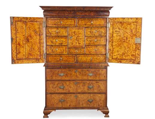 GEORGE I BURR WALNUT AND MULBERRY CABINET ON CHEST