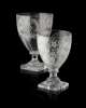 the larger example etched with the monogram JE with wheat sheaf and hops, on a lemon squeezer square foot, 18cm high, 12.5cm diameter; the smaller etched with the monogram JH and the figure of Bacchus seated on a wine barrel with fruiting vines, 15cm high, 10cm diameter (2)