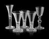 each with a trumpet bowl above a double twist stem and thick conical foot, 15cm high; together with TWO WINE GLASSES, one with a trumpet bowl, 19cm high; the other with a knopped stem, 17,5cm high (5)
