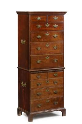 the upper part with a moulded cornice above two short and four graduated drawers; the lower part with a brushing slide above two short and three further long drawers, raised on bracket feet; the sides mounted with brass handles