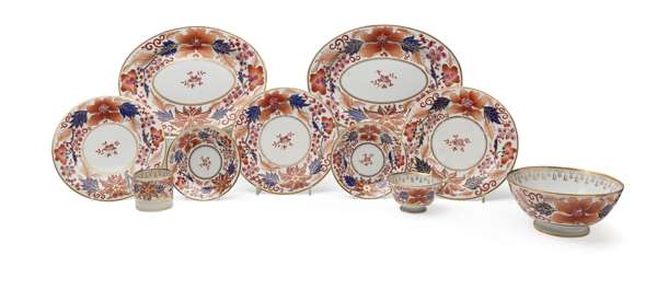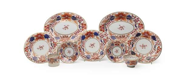 decorated in the Imari palette in gilt and coloured enamels with underglaze cobalt blue, comprising eight small tea cups and saucers; two large teacups and five saucers; four coffee cans and four saucers; a slop bowl; two oval serving dishes; ten side plates; and two large socketed dishes, impressed factory marks (48)