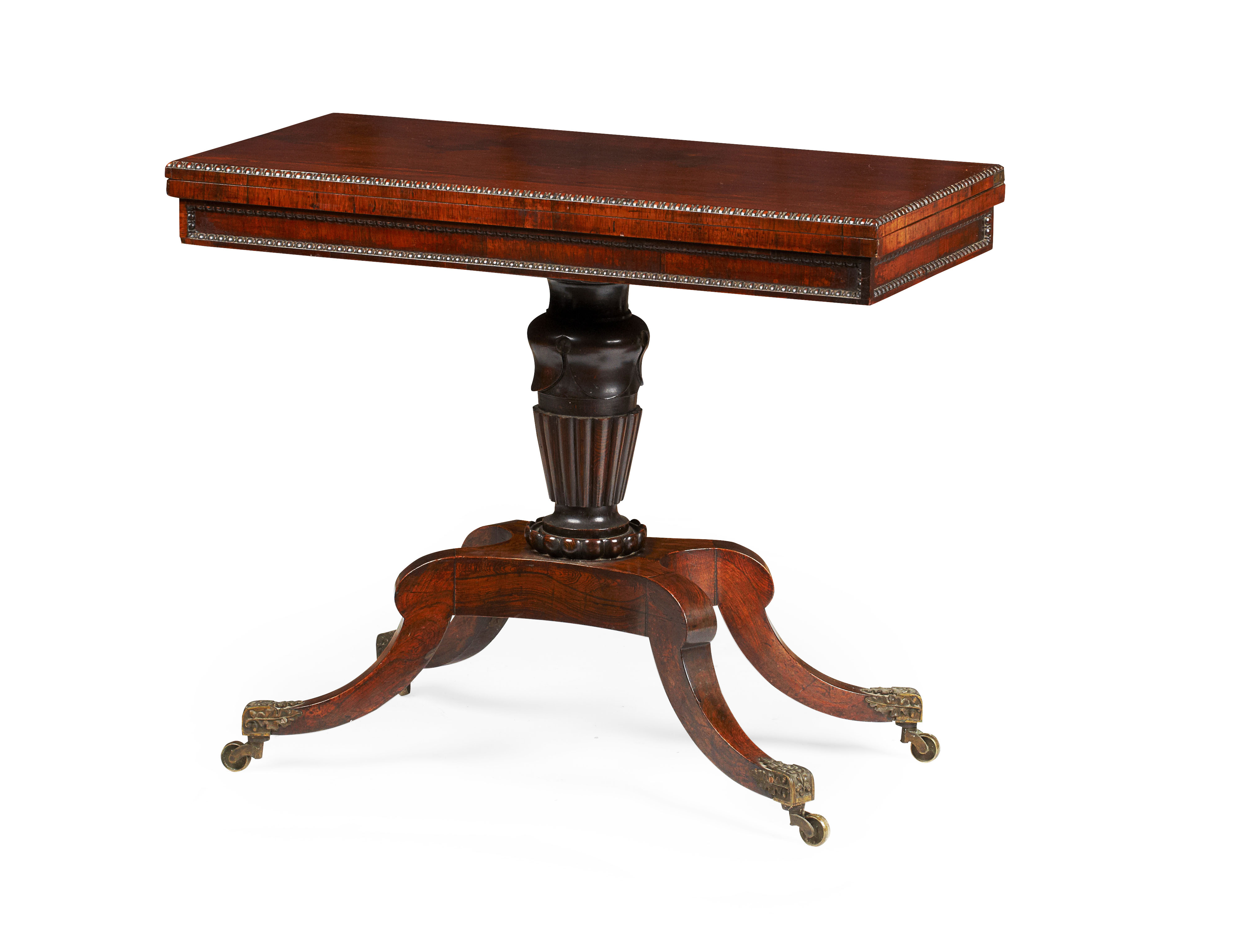 The pivoting rectangular foldover top with bead moulded edges, on a lotus and part reeded baluster support, raised on a quadriform base with hipped sabre legs ending in leaf cast brass caps and castors