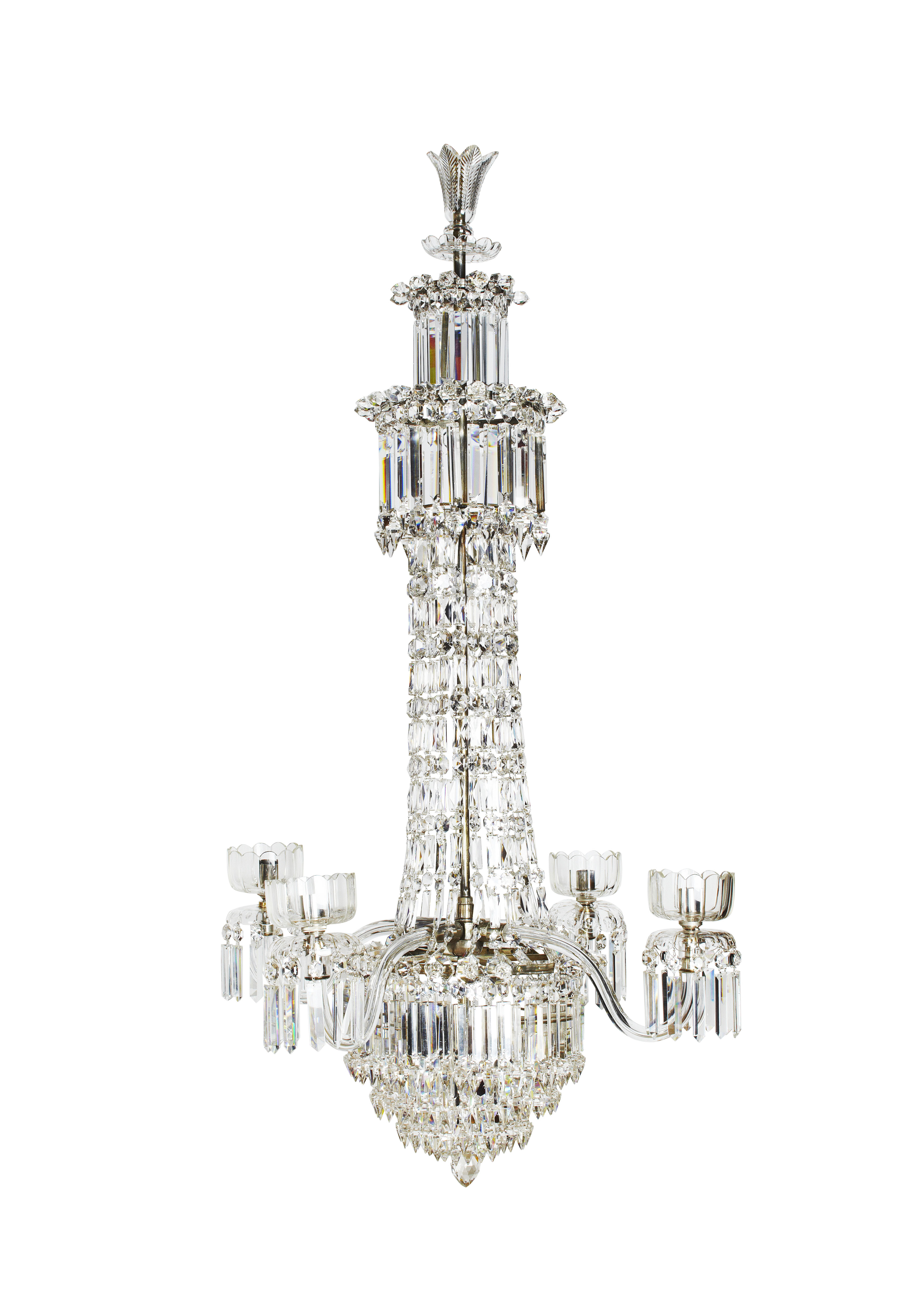 the tulip form finial above two stepped tiers over downswept facetted strands, the lower ring issuing four scrolling arms with foliate drip trays, over a graduated tier base hung with prism drops, centred by a pointed ball pendant finial, with a heavy square link hanging chain