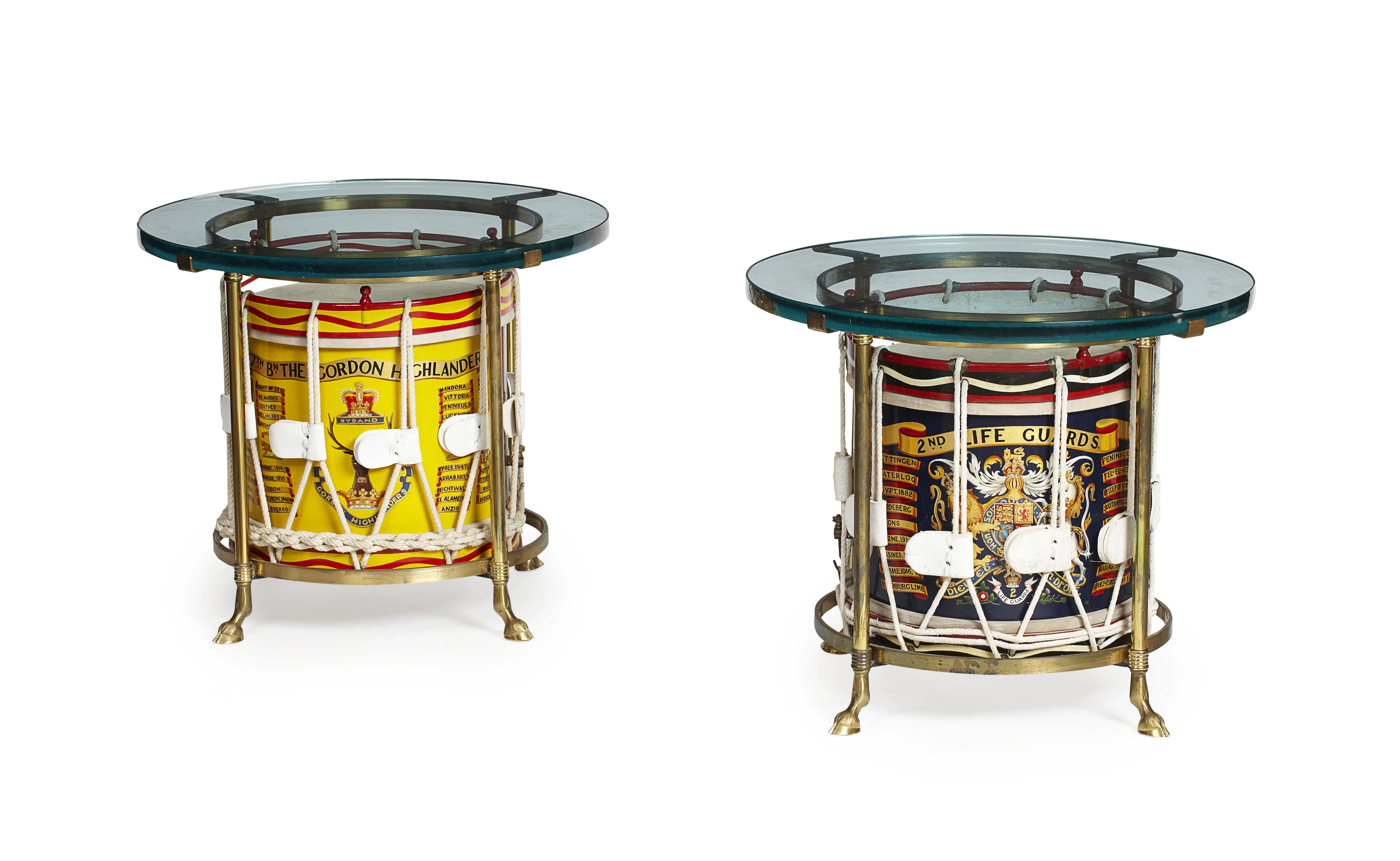 one drum from the 4th/7th Battalions The Gordon Highlanders; the other from the 2nd Life Guards; in brass framed stands fitted with thick circular glass tops (2)