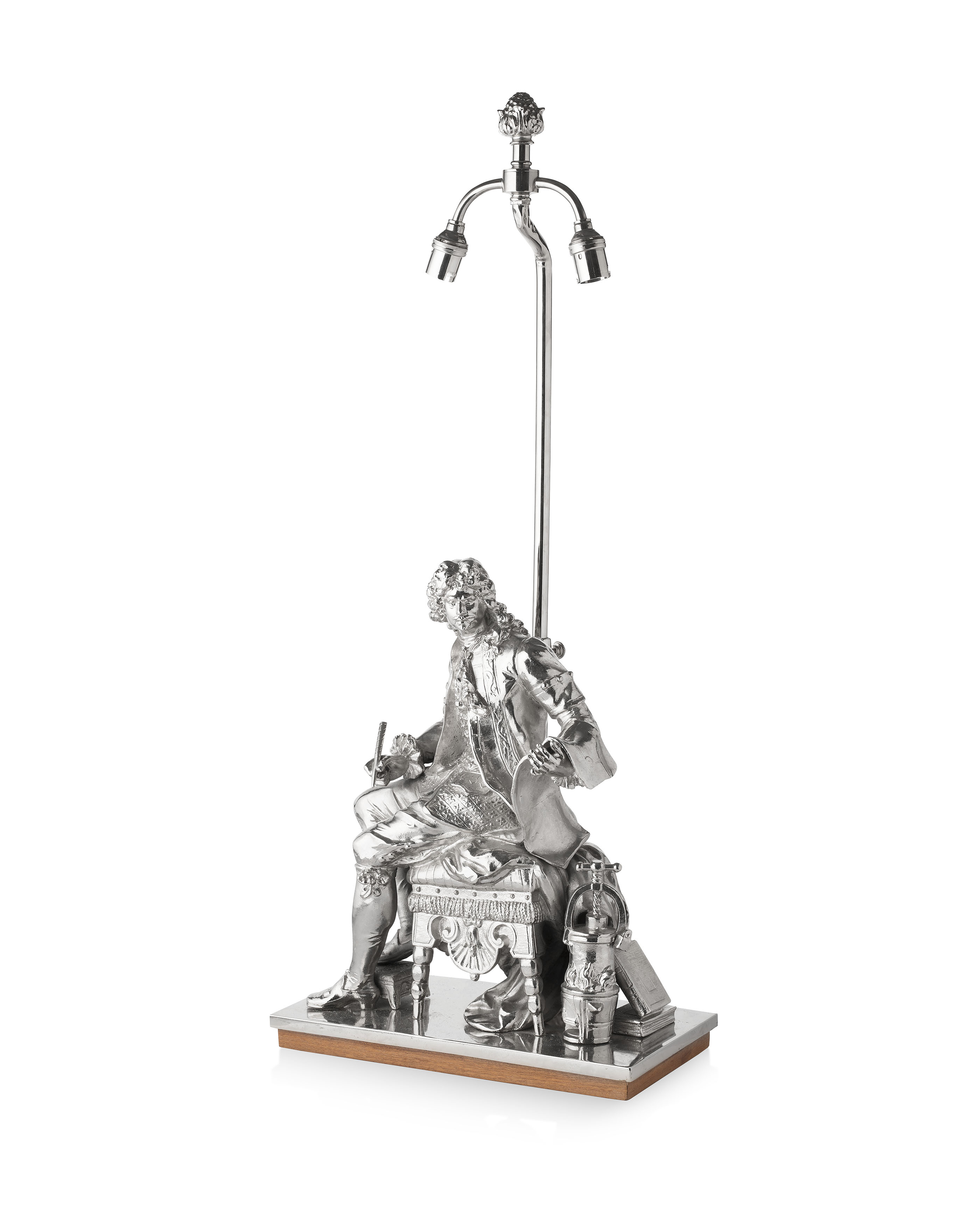 with a figure of a gentleman in 17th century dress seated on a stool, on a rectangular base, mounted as a lamp