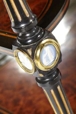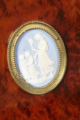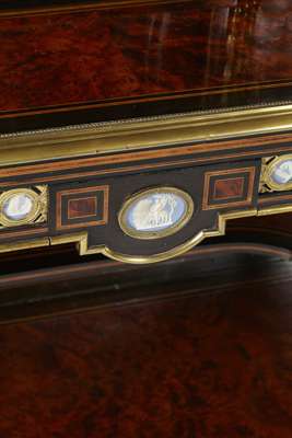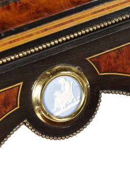 FINE VICTORAIN BURR WALNUT, EBONY, JASPERWARE AND BRASS MOUNTED BUREAU DE DAME