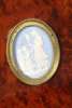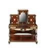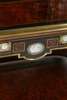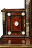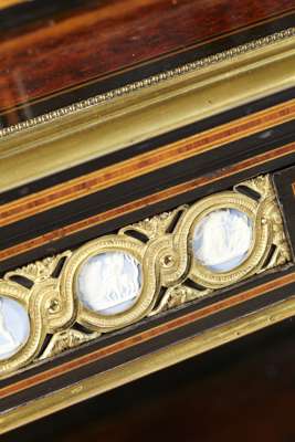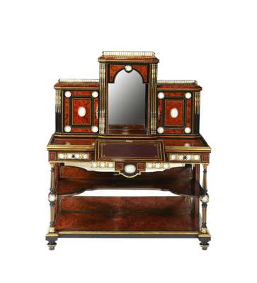 in two parts; the superstructure with a brass gallery above a mirrored arched recess flanked by doors; the base with a central frieze drawer fitted with a ratchet adjustable writing slope flanked by two short drawers, raised on tapered fluted columns over a shaped undertier and mirror back, on an inverted breakfront base raised on toupie feet; outlined throughout with brass banding and mounts, with forty-six blue and white jasperware plaques
