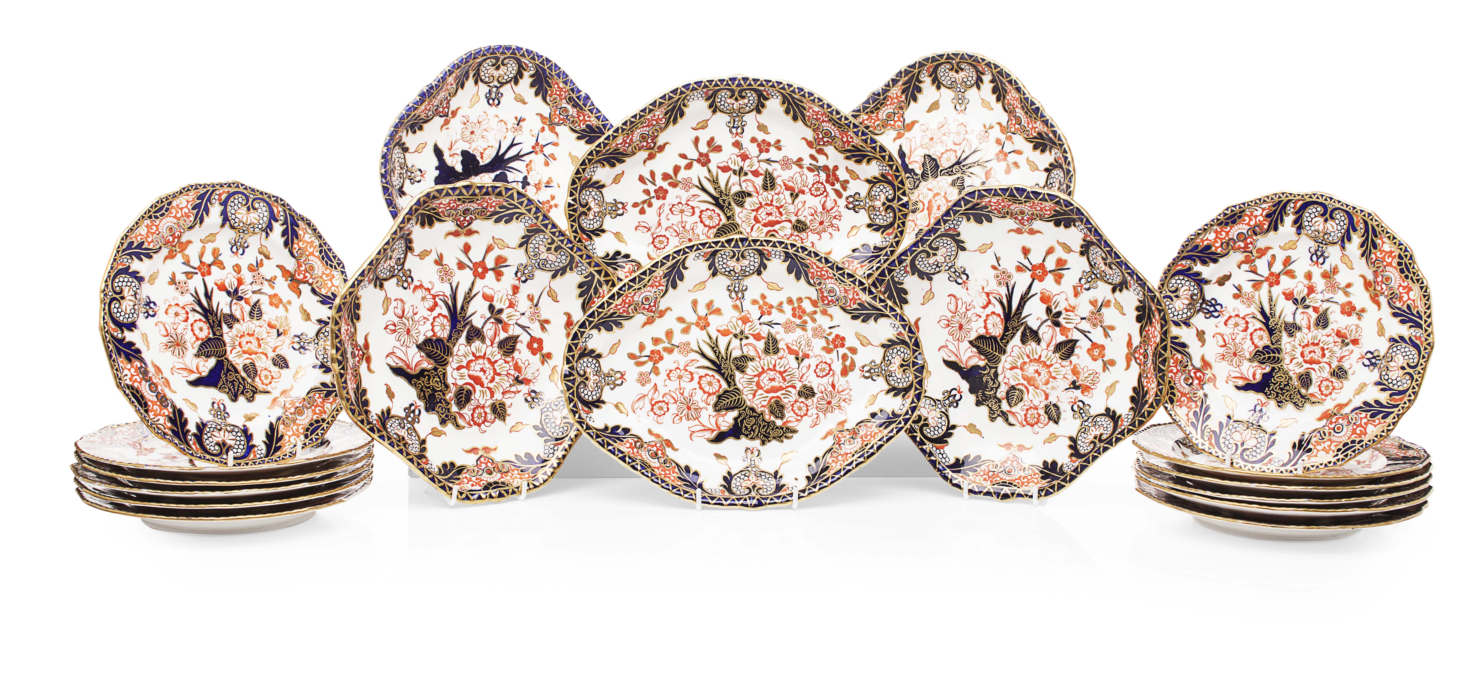 in the Imari palette comprising two square dishes; two shell shaped dishes; two oval dishes; and twelve plates, with impressed mark DERBY, red maker's marks and date codes (18)