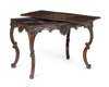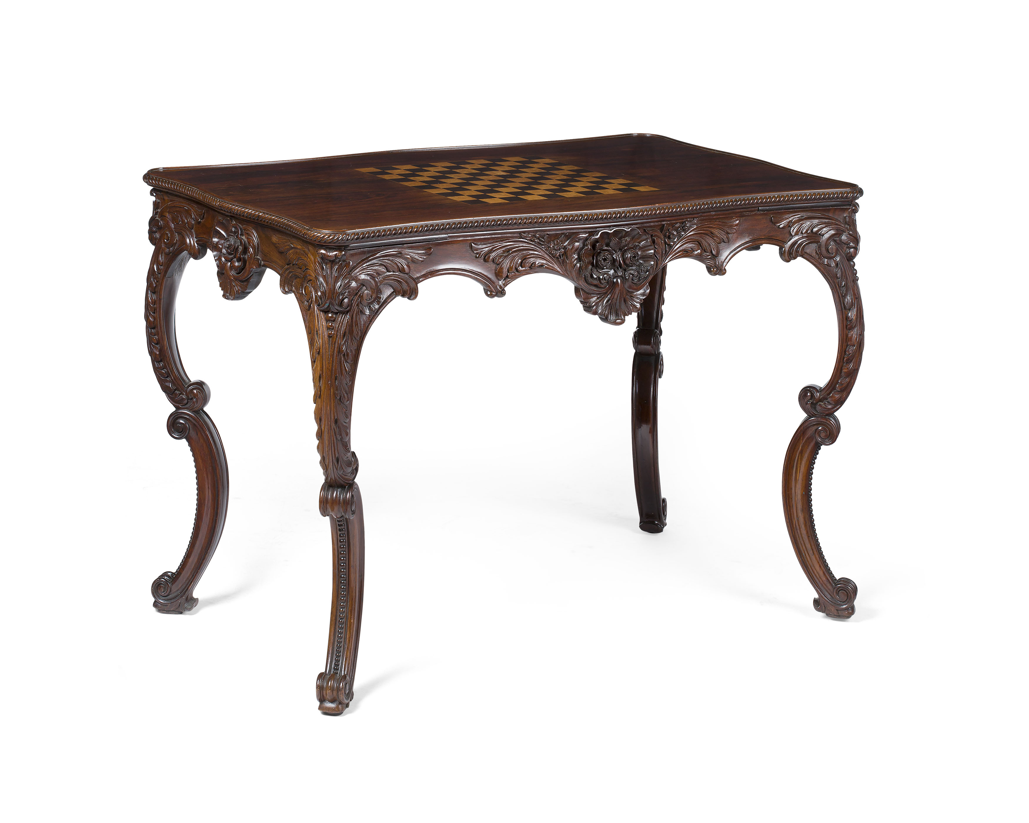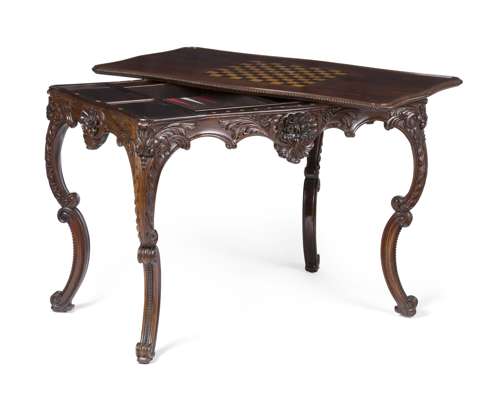 in the rococo style, the shaped rectangular reversible top centred by an inlaid chess board with a gadrooned edge, the reverse with a green baize playing surface; when removed revealing a backgammon board and covered wells; raised on acanthus carved double C scroll legs ending in scroll toes