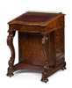 the red leather lined slant top opening to a bird's eye maple interior, over four short drawers with four dummy drawers opposing, raised on foliate and fruit carved serpentine legs and flattened bun feet