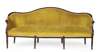 the serpentine back continuing to enclosed part-padded arms ending in scroll hand terminals, above a long seat, raised on fluted tapered legs headed by floral carved blocks, upholstered in pea green plush fabric