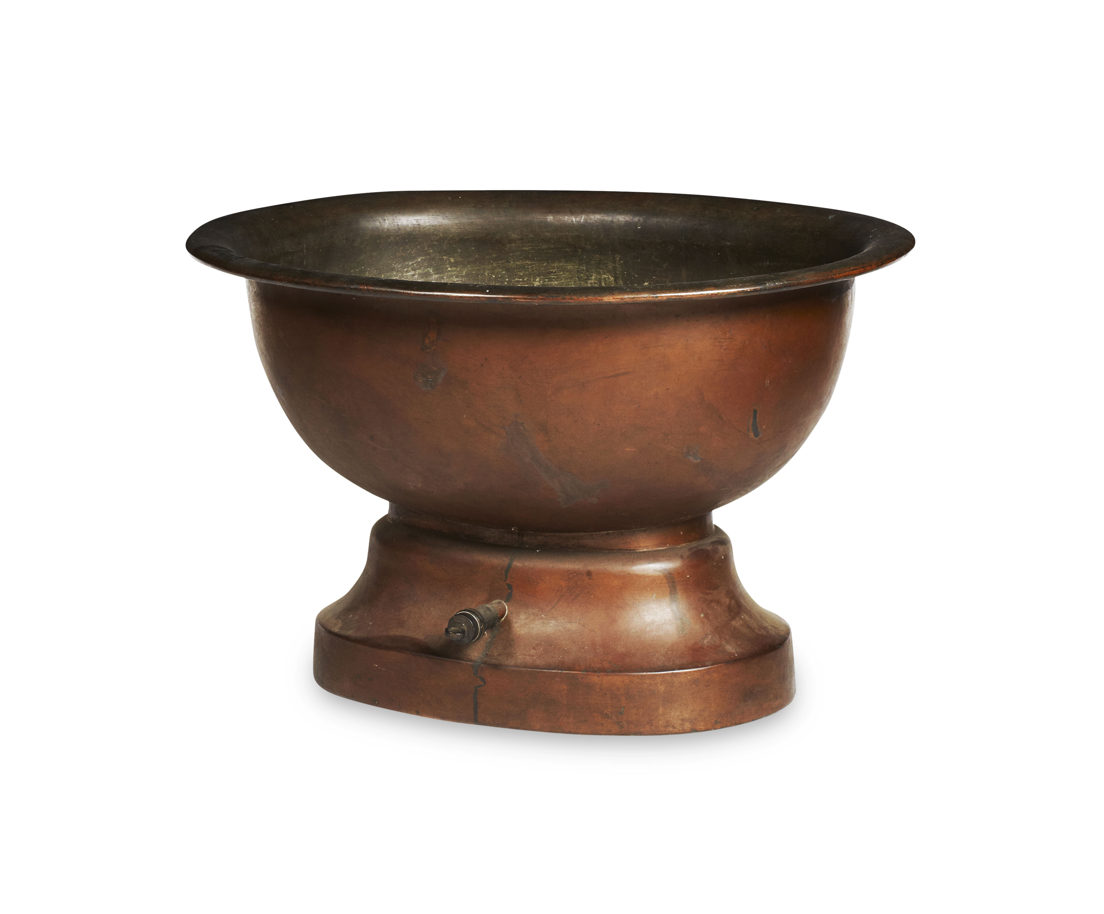 the oval ogee moulded bowl lined with tin, raised on a conforming foot fitted with a tap