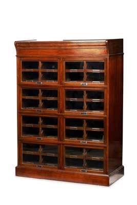 the moulded cornice above eight pairs of glazed doors each opening to four sliding trays, on a plinth base